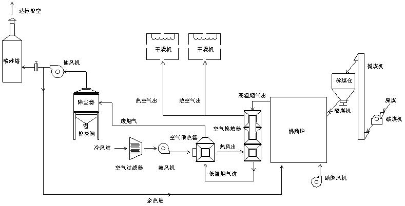 After the discussion and research of the project team, the system adopts the boiling furnace, tubular heat exchanger, multi-tube + water film dust removal process composition, the boiling furnace uses fluidized bed combustion technology, fuel adaptability is wide, can burn a variety of coal caloric value is lower than 3000kcal/kg, and the heating temperature is adjustable, the temperature is adjusted quickly, the burning rate is as high as 99%; The high temperature section of tubular heat exchanger is made of heat-resistant stainless steel, and the unique quinum-shaped jet tube structure is designed, which can effectively improve the heat exchange efficiency, reasonable bundle arrangement, and control the flue gas flow rate to be stable at 10m/s, which can avoid pipe ash accumulation. Dust removal system for dry method + wet method scheme, that is, waste flue gas first through the multi-pipe multi-dust collector, the dust collector is composed of a number of ceramic cyclone, dust removal efficiency can reach more than 95%, wind resistance is less than 900Pa, low operating cost; Then enter the water film dust removal tower, can further purify the waste gas, add desulfurizer, can desulfurize the flue gas.